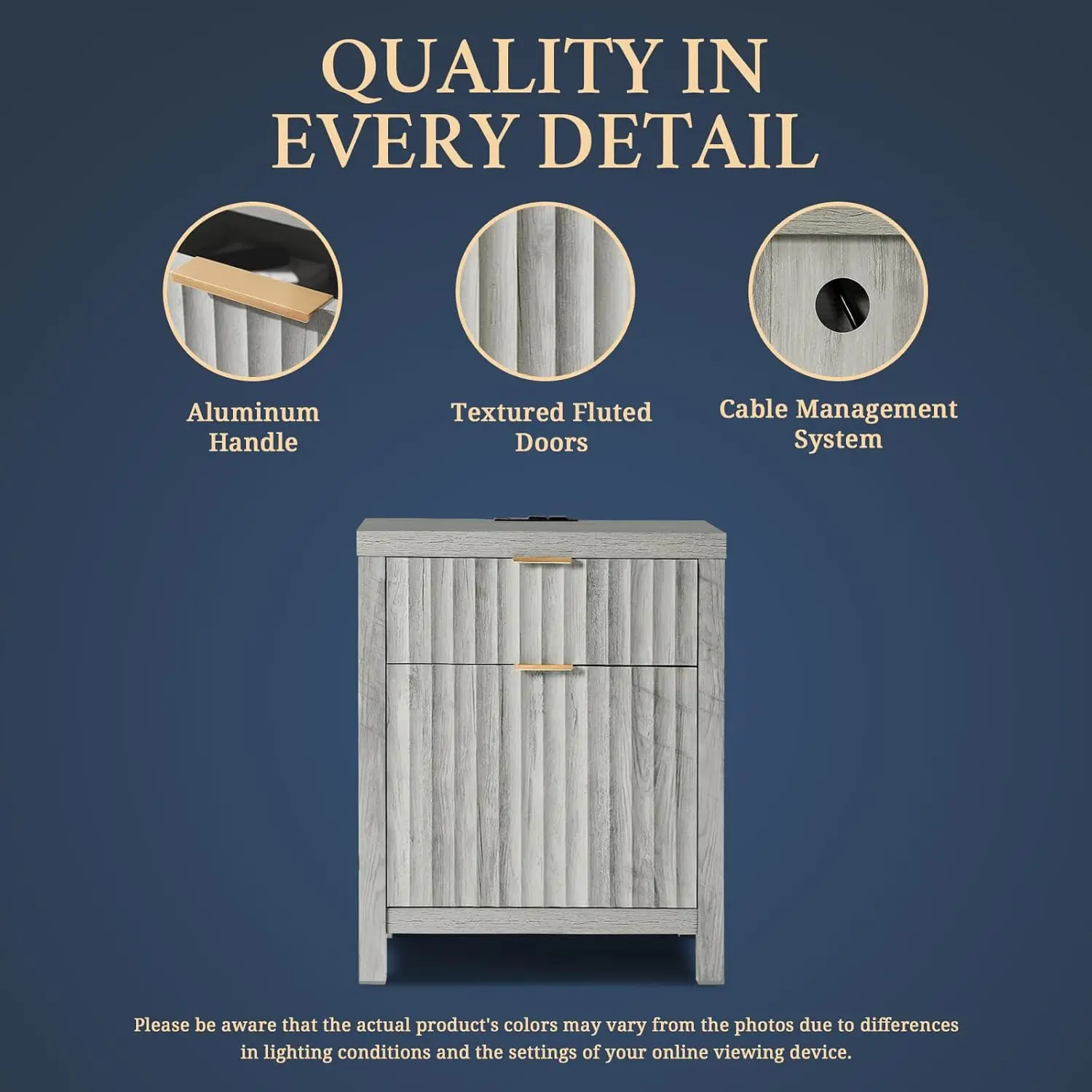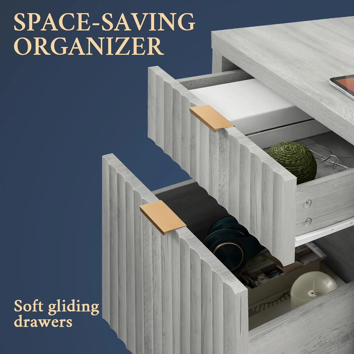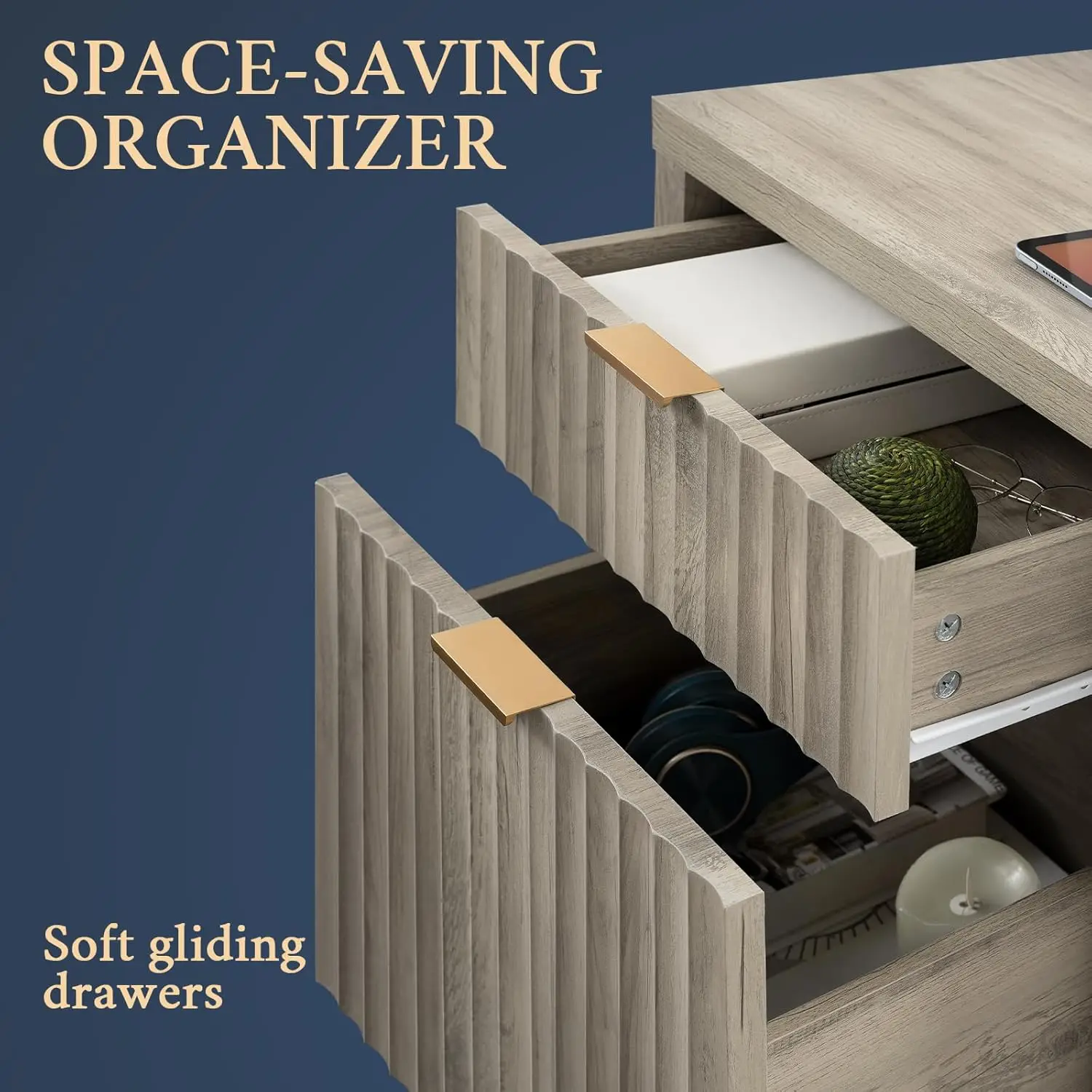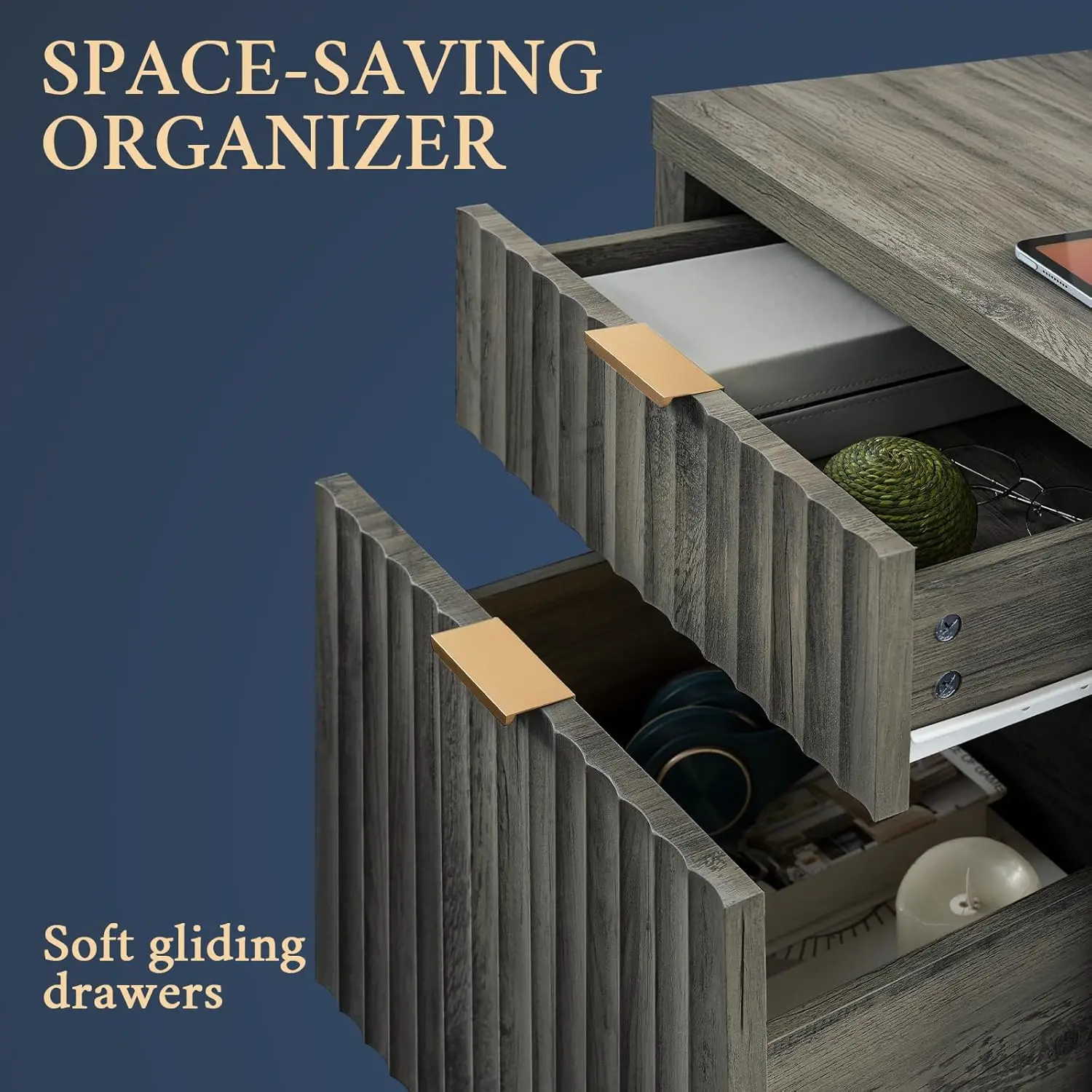 - Natural Elegance Meets Fashion: Drawing from the fluid beauty of nature, the Wave Panel design captures the gentle yet powerful rhythm of natural elements. Complemented by durable rose gold aluminum handles, this nightstand combines nature's grace and lasting strength, offering an enduring and exquisite addition to any space