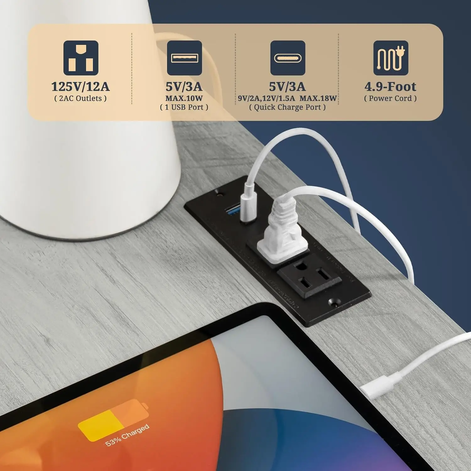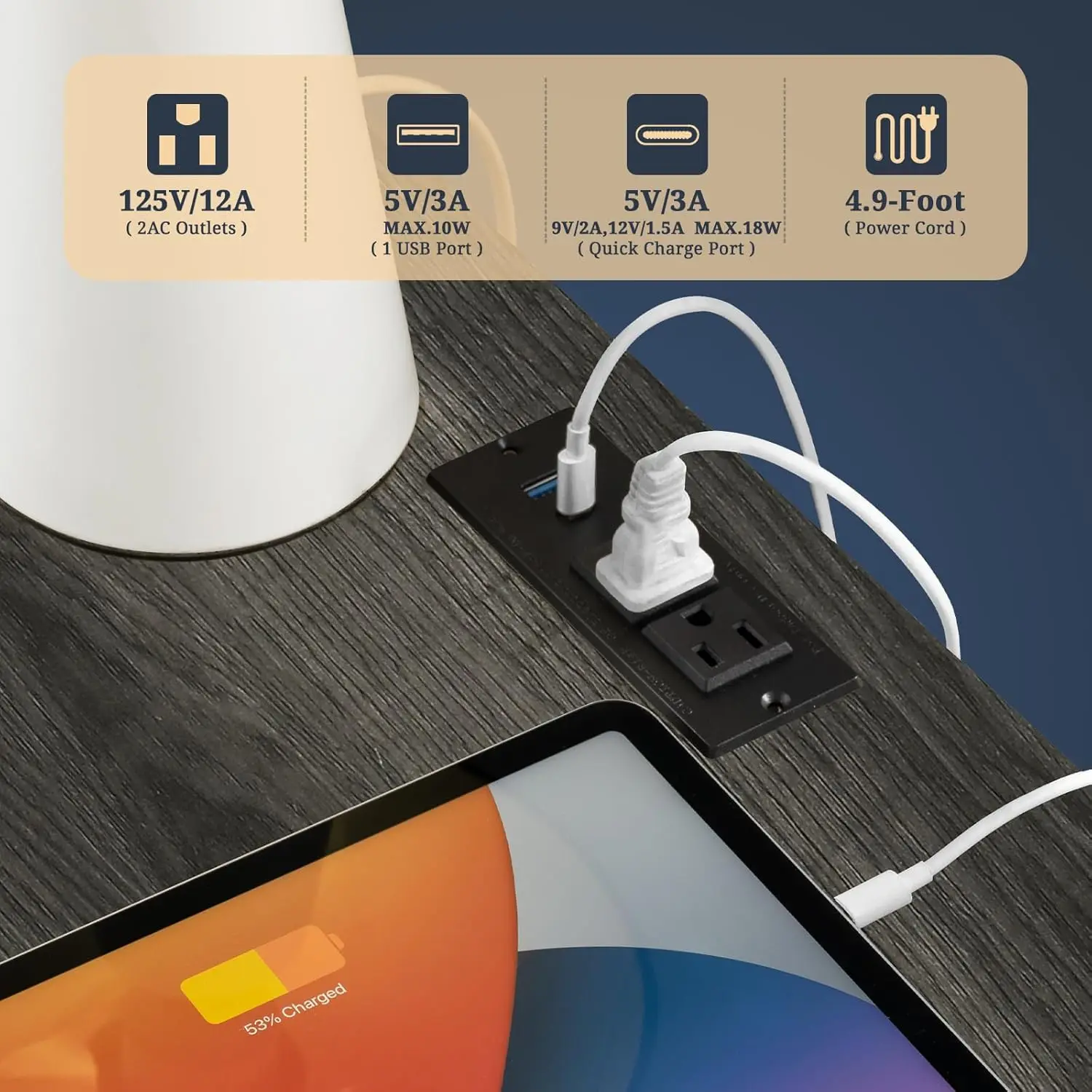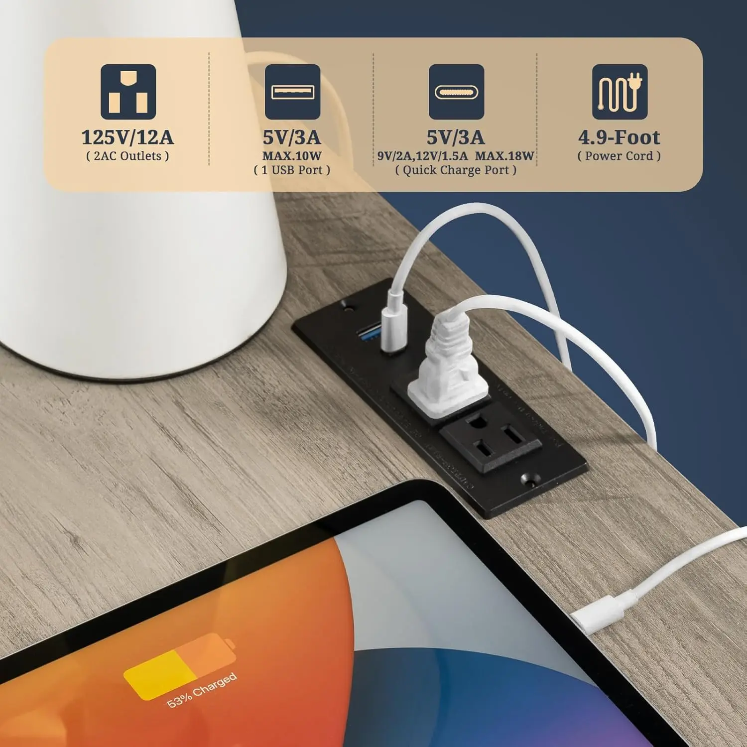 - Charging Nightstand with Convenience: Maintain the power of your essential devices and have them at your fingertips with our practical coffee table equipped with a built-in charging station. With 2 USB ports and 2 outlets, it allows you to effortlessly charge multiple devices simultaneously. The 4.9 ft power cord provides the flexibility to position the charging nightstand wherever you desire in your bedroom or living room