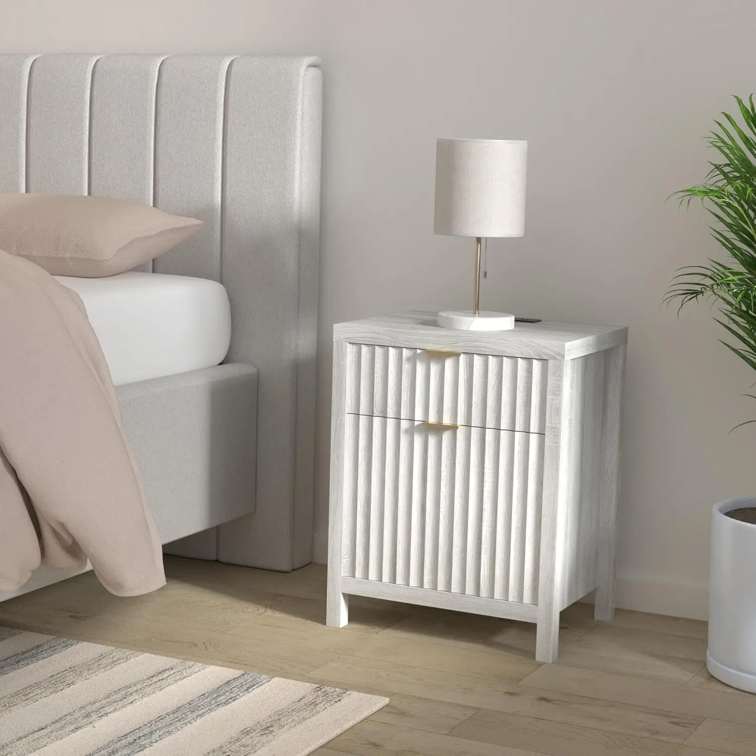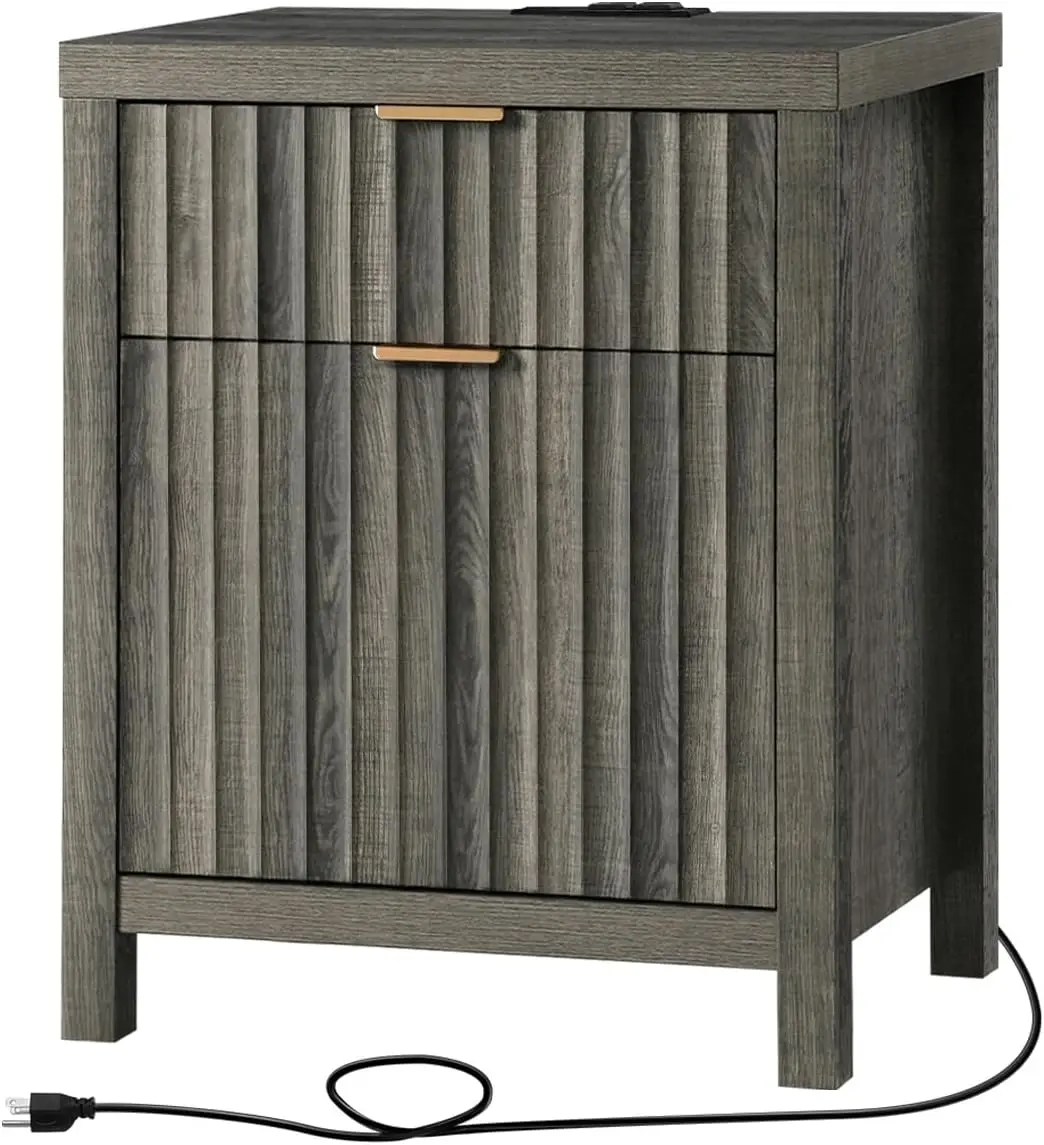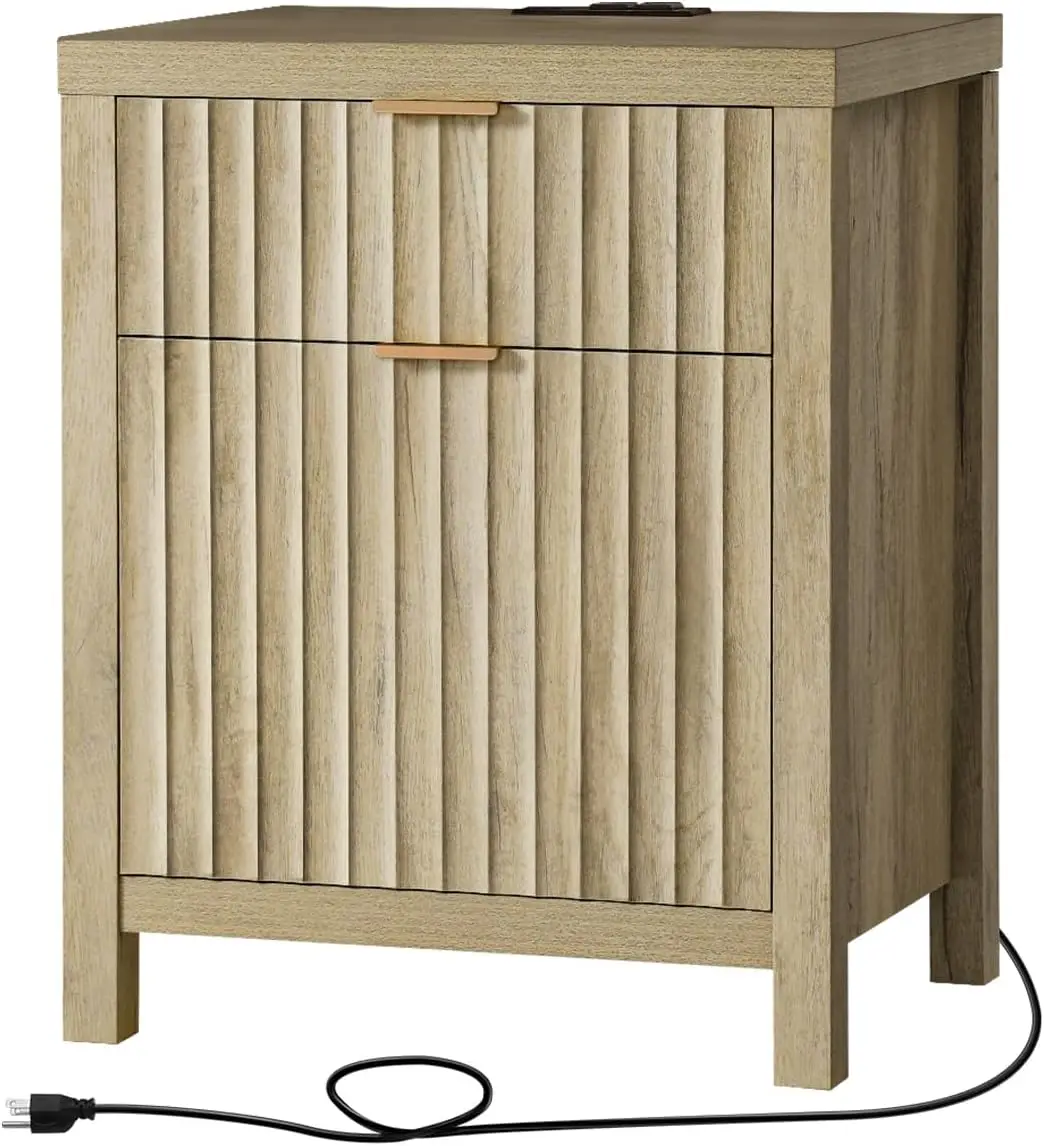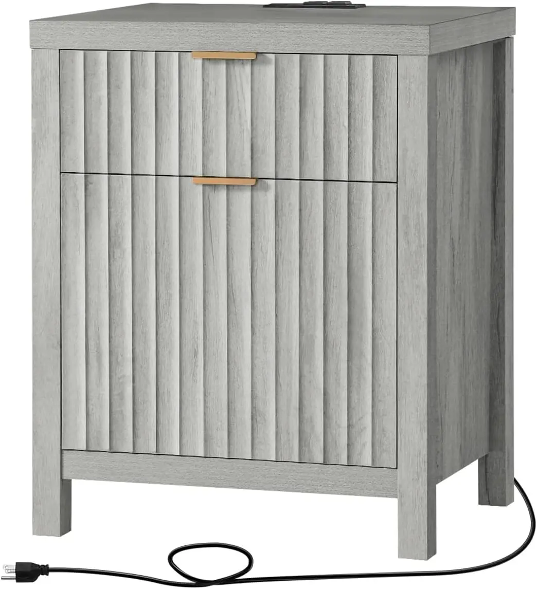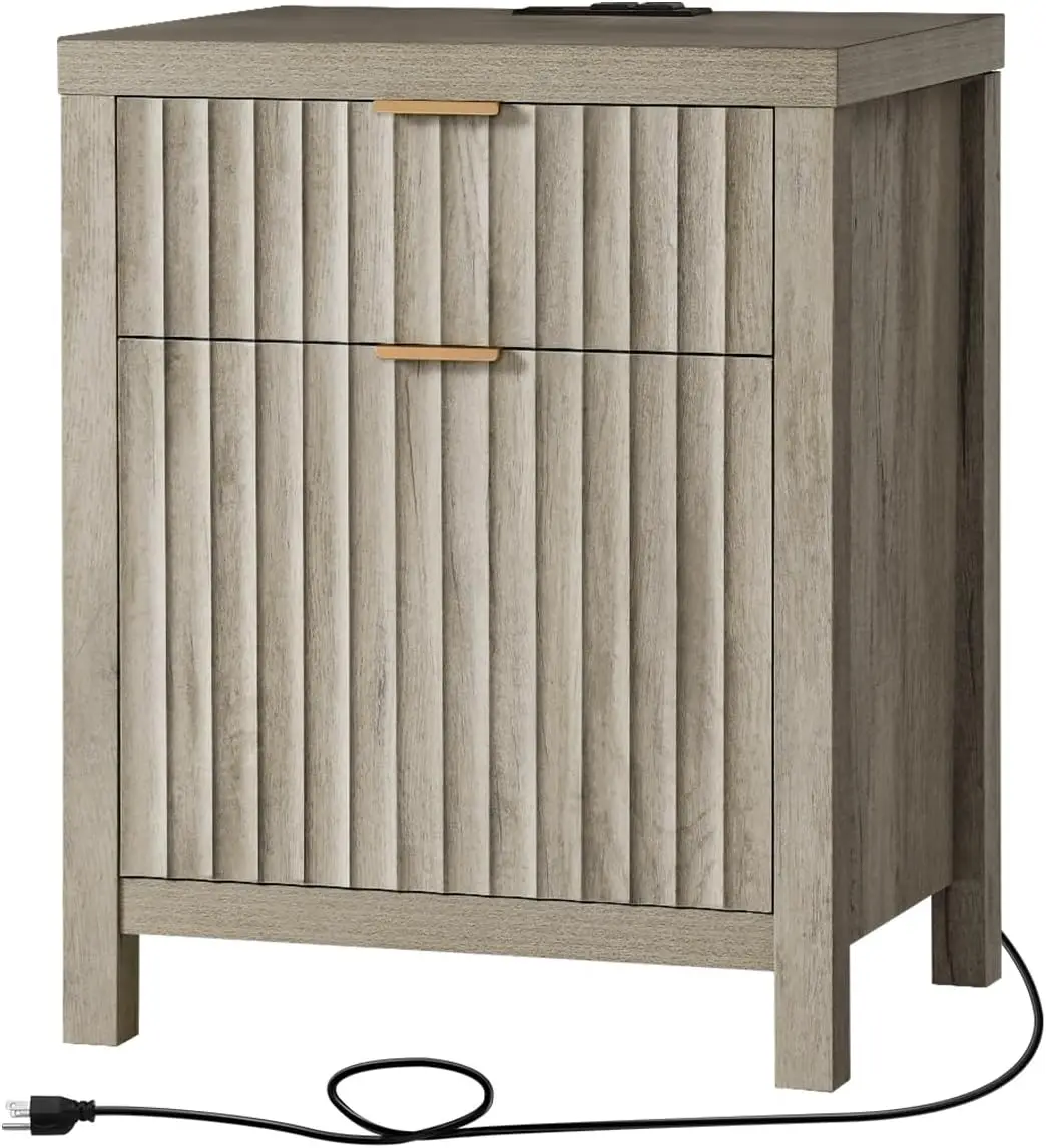 2 Drawer Nightstand, End Table with Charging Station, Night Stand with Fluted Panel, Farmhouse Sofa/Bed Side Table