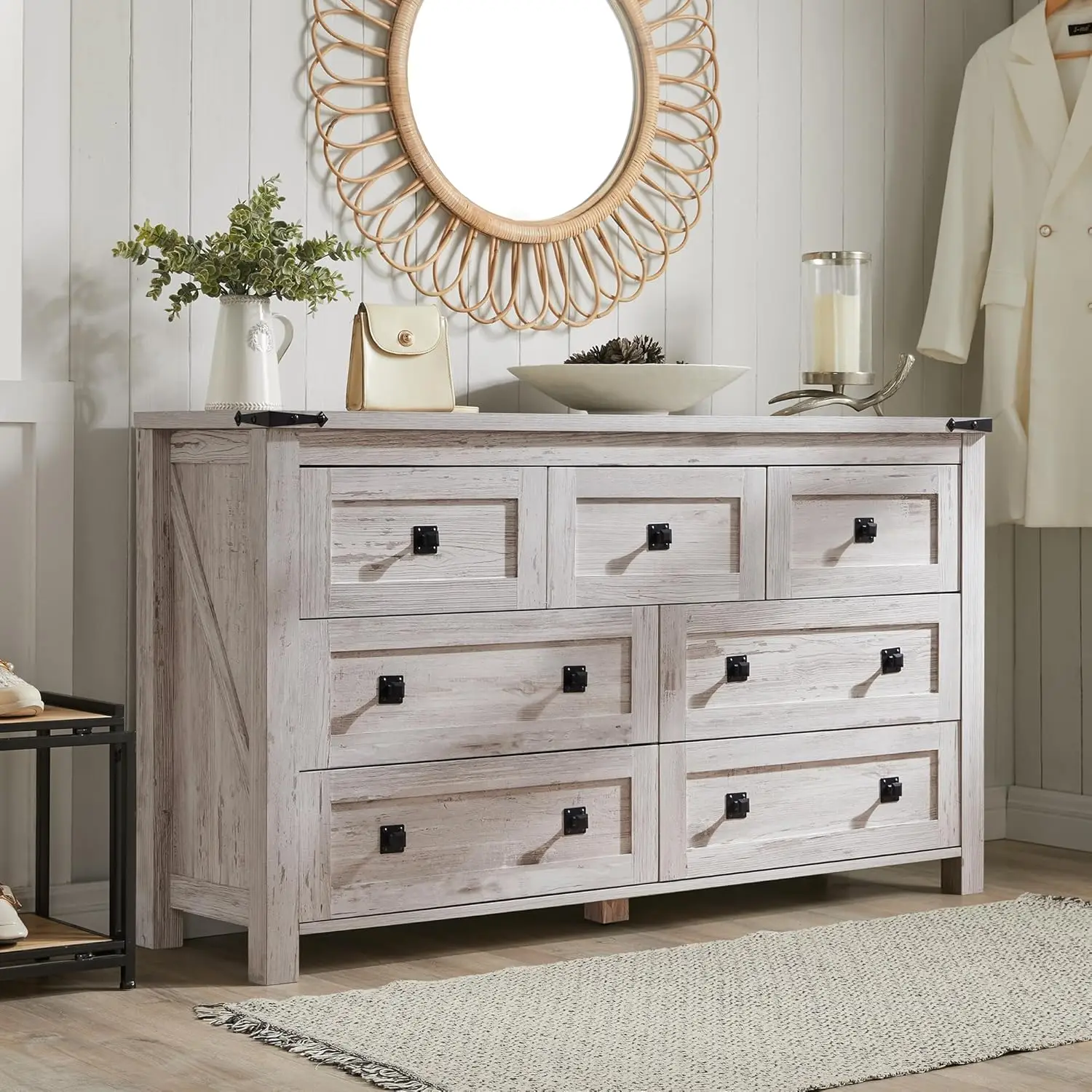 - 【Wooden Farmhouse 7 Drawers Dresser TV STAND】Rustic wooden 6 drawer dresser with barn door style and spacious design is a perfect combination of modern and farmhouse style, adding character and charm to your bedroom and living room. Can be used for TV Stand for 60'' TV/clothing organizer/lingerie dresser,entryway table, accent storage cabinet for living room.