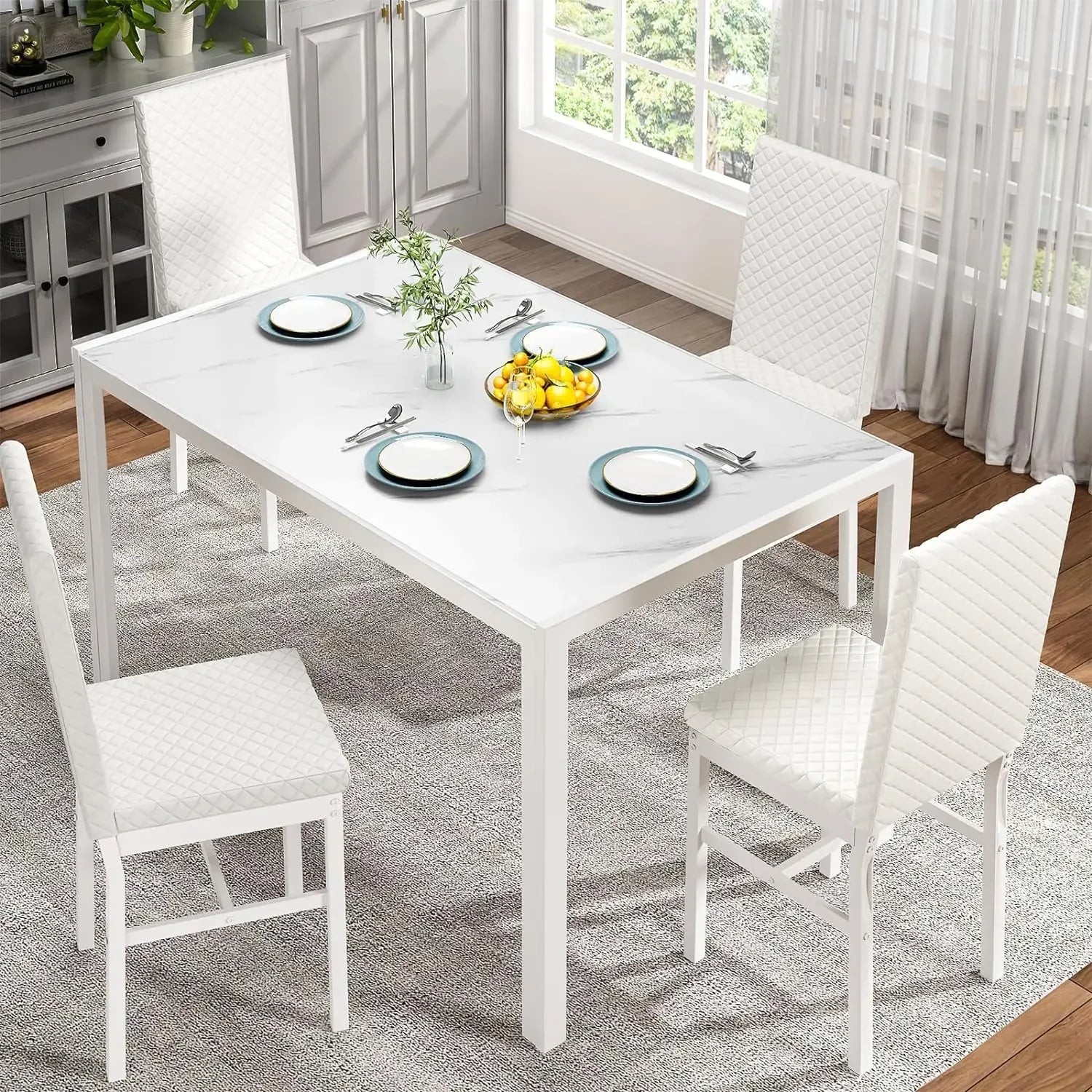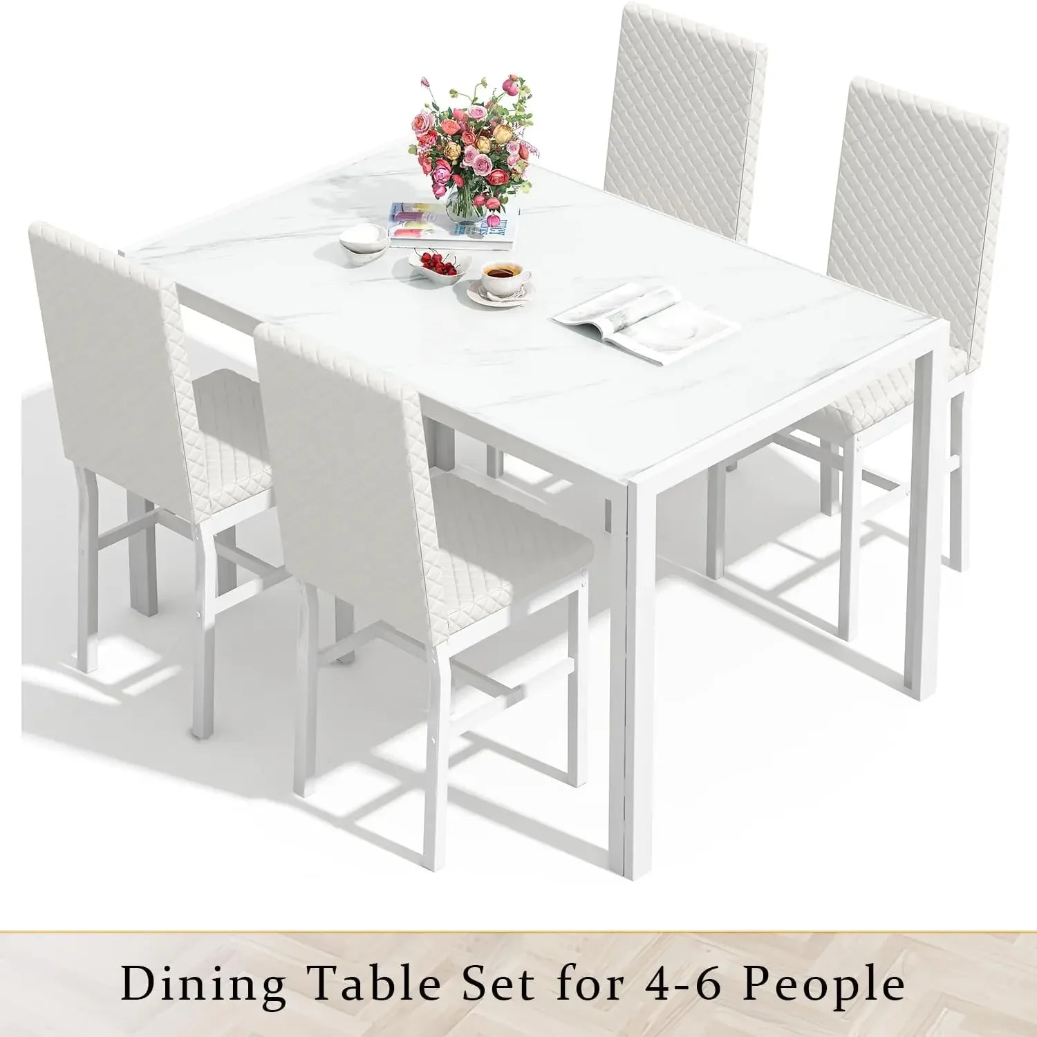 Elevate your dining experience with this modern minimalist dining room set designed to accommodate 4-6 people. Featuring a sleek and durable glass tabletop, this dining set is both stylish and functional. The set includes four comfortable chairs with high-density sponge seats upholstered in PU leather, providing a luxurious dining or work environment. Crafted with a sturdy metal frame and finished with a waterproof and anti-rust coating, this set offers long-lasting durability and easy maintenance, perfect for everyday use.