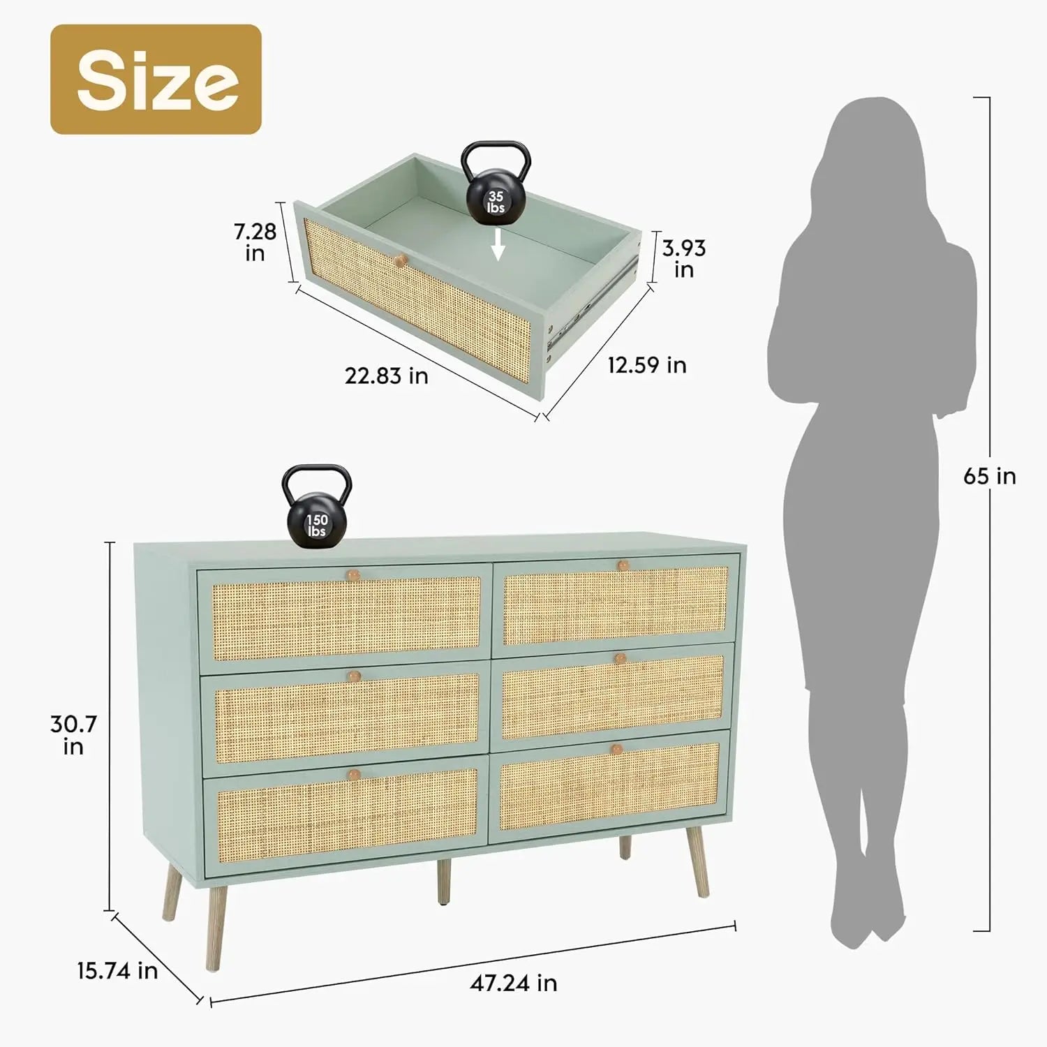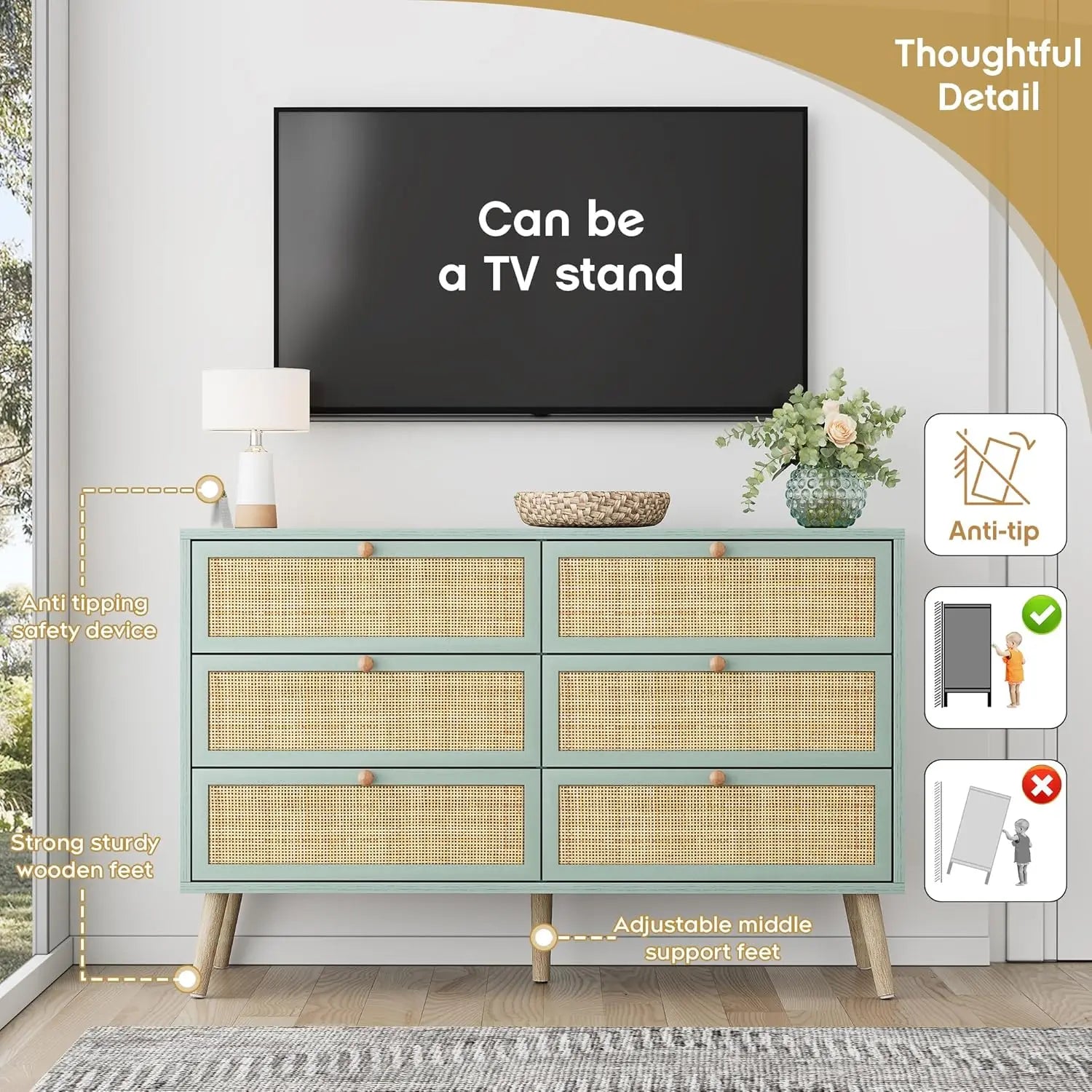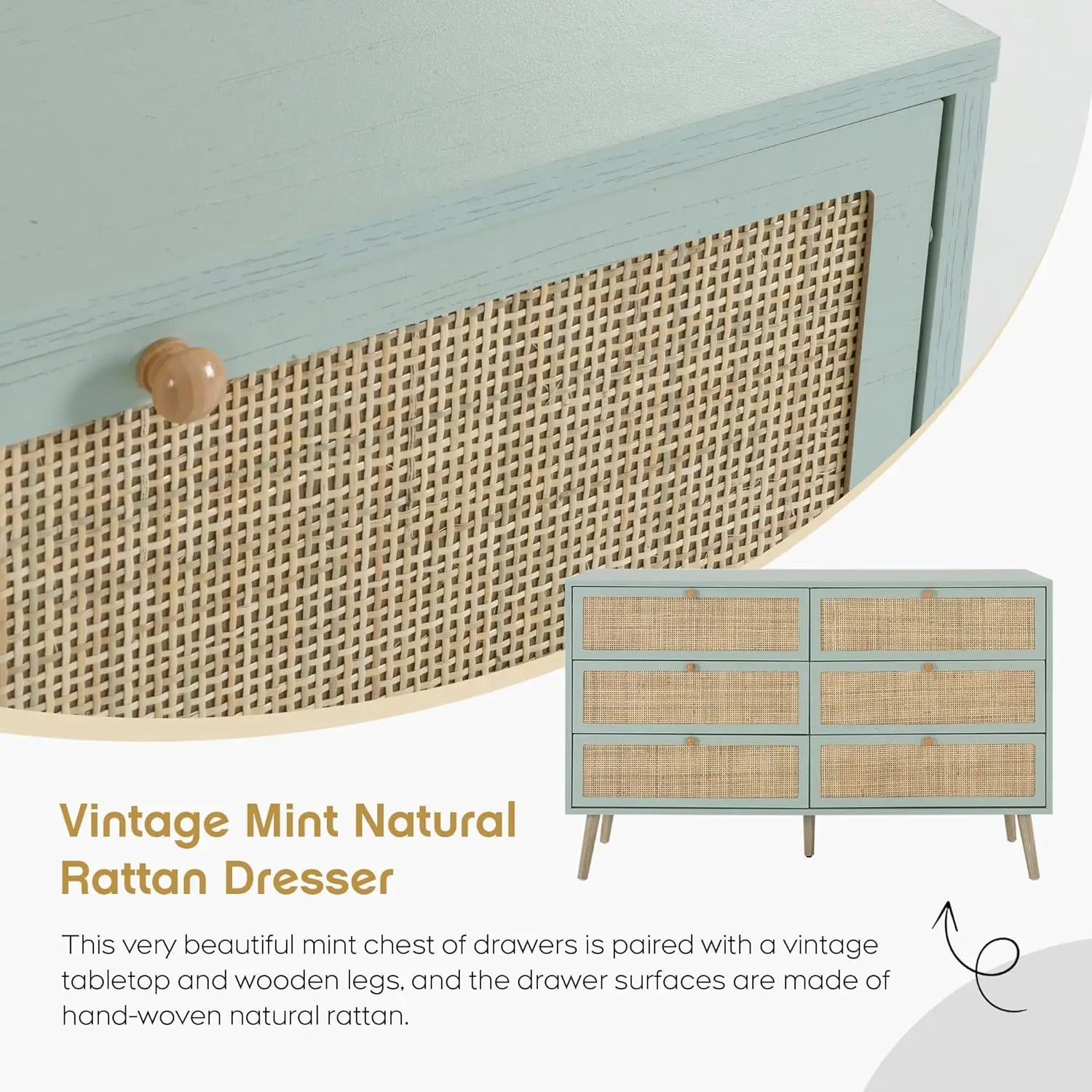 Vintage Natural Rattan 6 Drawers Dresser for Bedroom, Boho Double Chest of Drawers with Wood Handles for Closet